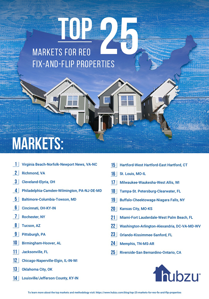 Hubzu, a leading online real estate marketing platform, today released data uncovering the top 25 U.S. metropolitan statistical areas (MSAs) for Real Estate Owned (REO) fix-and-flip properties that were bought and sold from October 2018 to October 2019. Virginia Beach, VA, Richmond, VA and Cleveland, OH came out on top for investors pursuing REO fix-and-flip properties based on a number of factors including the number of REO flip properties in the market, profit after the repairs and average number of days the listing is on the market after repairs are complete.